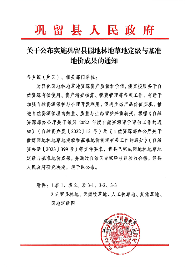 关于公布实施巩留县园地林地草地定级与基准地价成果的通知