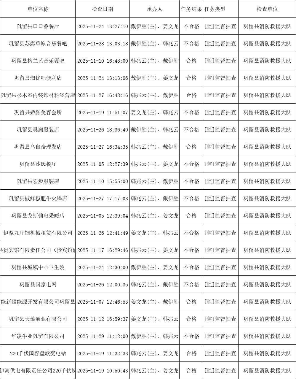 巩留县消防救援大队2025年11月双随机、一公开监督检查结果