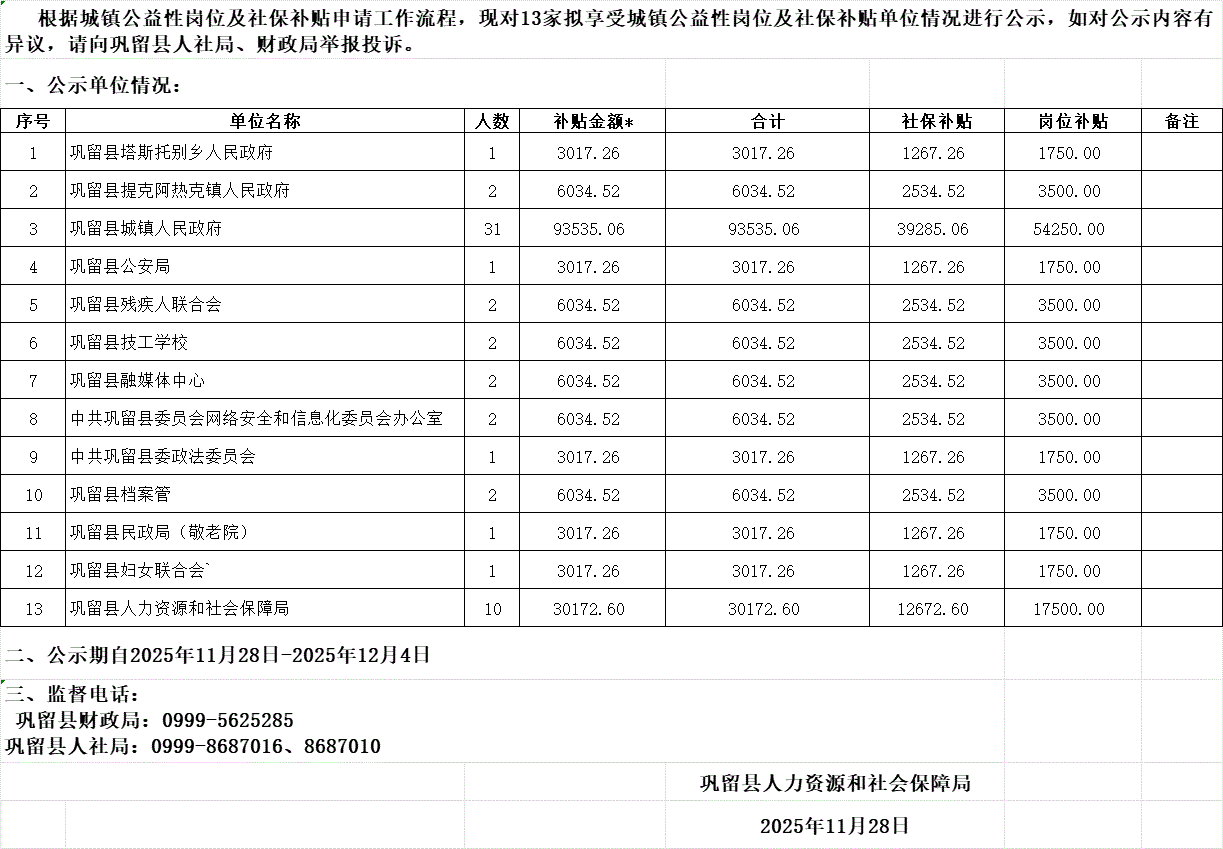 2025年城镇公益性岗位及社保补贴补贴公示