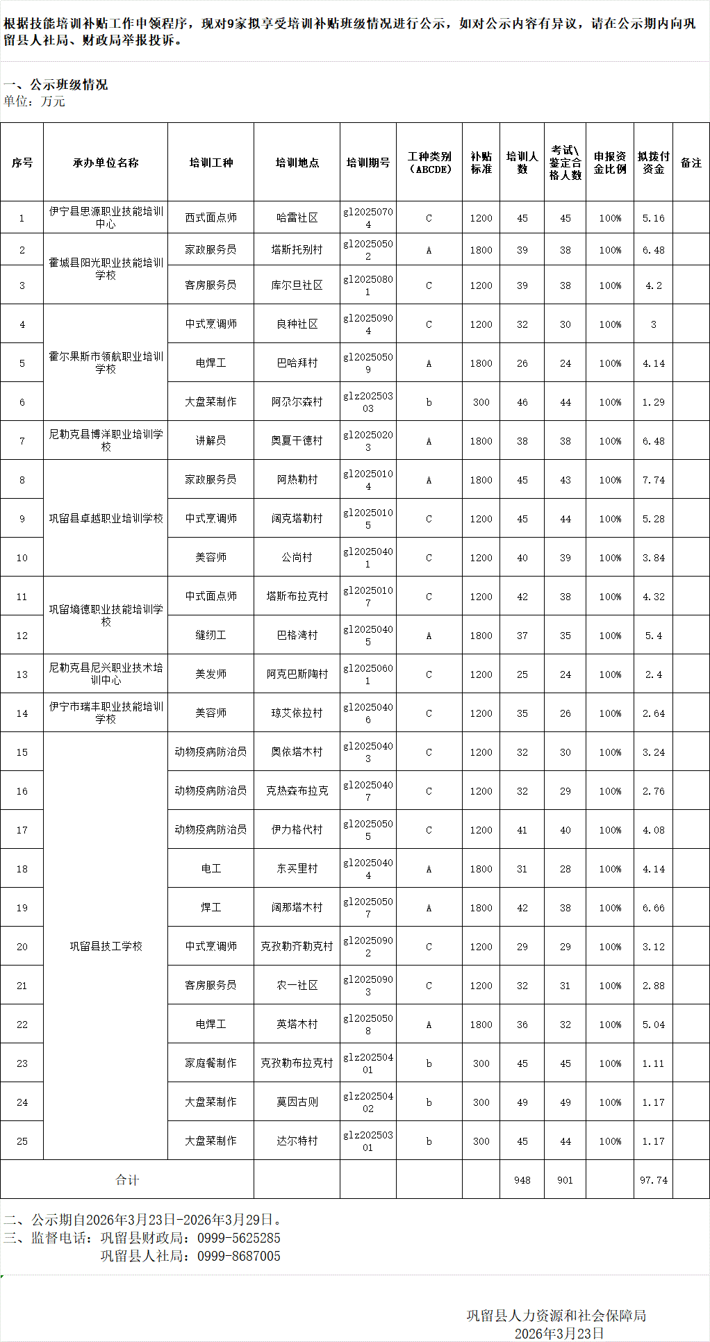 2026年培训补贴班级公示