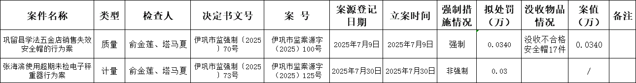 巩留县市场监督管理局2025年第三季度产品质量、计量监督、认证认可案件查办登记台帐