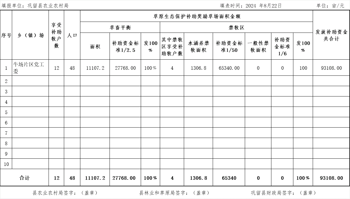 巩留县2025年度第二批草原生态保护补助奖励资金申请发放汇总表