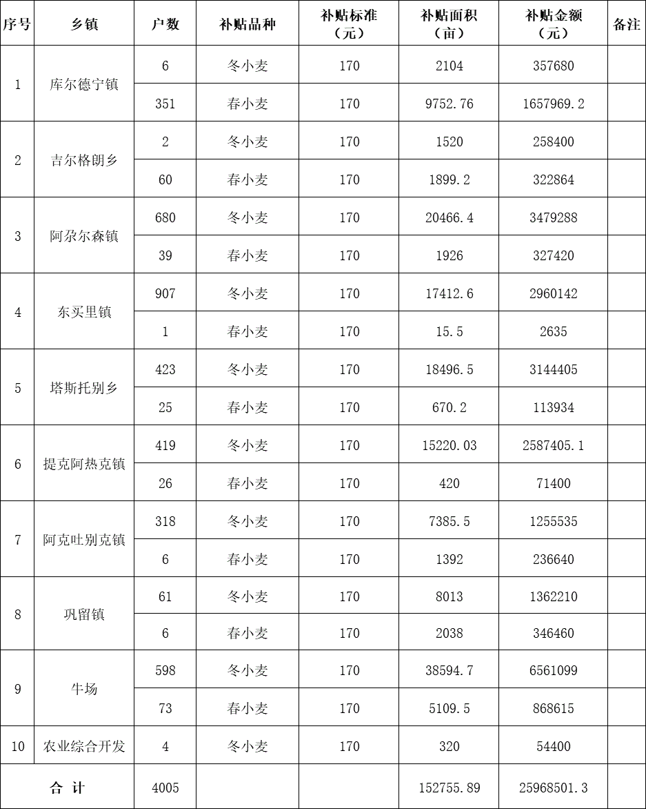 巩留县2025年耕地地力保护补贴汇总表(小麦)