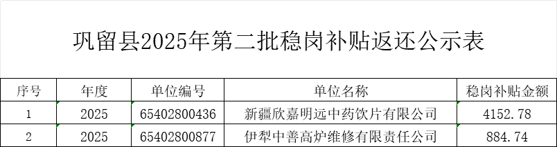 附件:巩留县2025年第二批稳岗补贴返还公示表