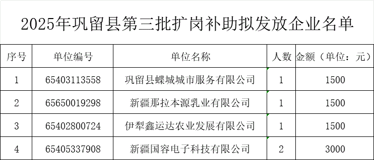 附件:2025年巩留县第三批扩岗补助拟发放企业名单