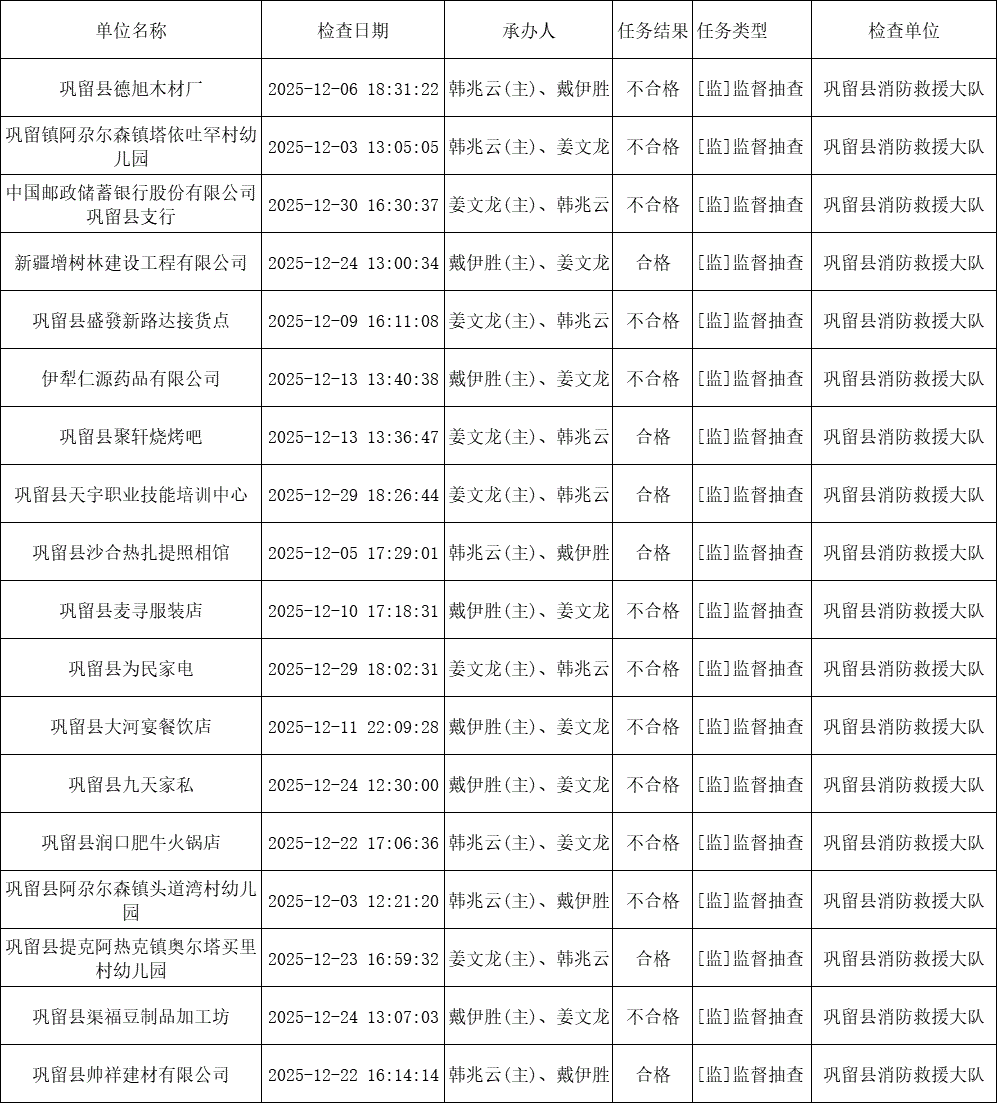 巩留县消防救援大队2025年12月双随机、一公开监督检查结果