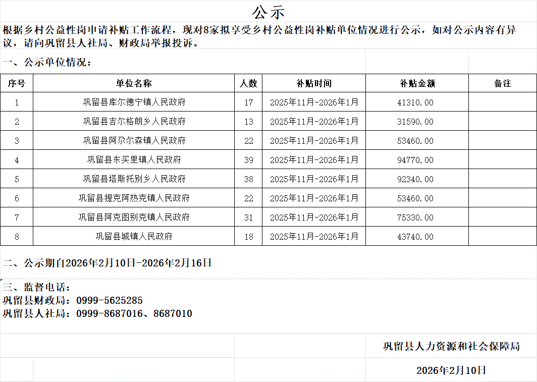 乡村公益性岗-城镇公益性岗位及社保补贴补贴公示