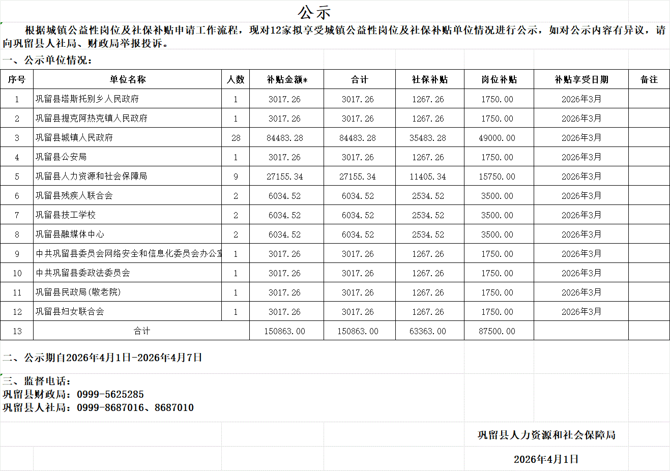 (2026年3月)城镇公益性岗位及社保补贴公示